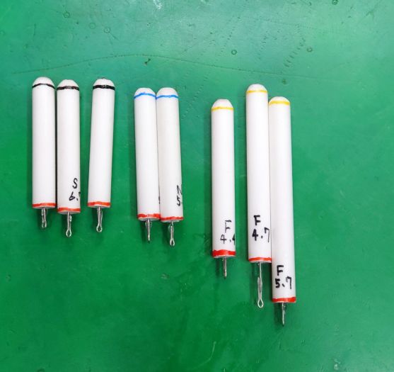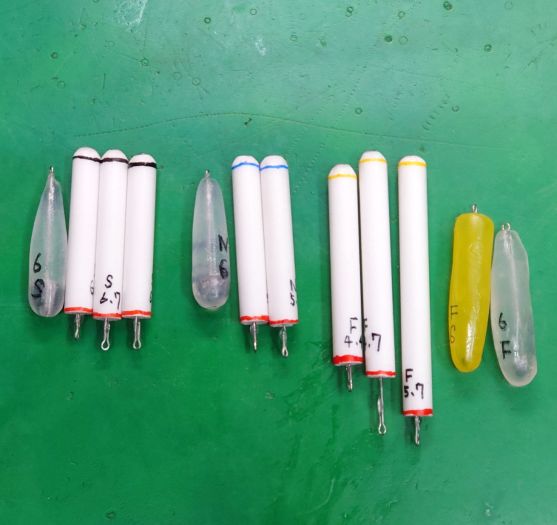 F、発泡材7cm、オモリ2.7gで仕上がり4.44g 水道水では0.9gで沈まない。 F、発泡材8cm、オモリ2.7gで仕上がり4.75g 水道水では1.4gで沈まない。 F、発泡材9cm、オモリ3.5gで仕上がり5.73g 水道水では1.4gでギリ沈まない。 N、発泡材6cm、オモリ3.5gで仕上がり5.08g。 S、発泡材6p、オモリ5.0gで仕上がり6.71g。