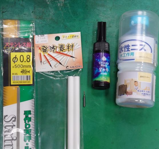 10φの発泡材にシンカー(ジャッカルシンカー JK タングステンカスタムシンカー スティックダウンショット)を差し込み、UXーLED(パジコ UV-LED レジン 星の雫 ハード)で固めるだけ。(UXーLEDを硬めるのは紫外線ライトが必要)