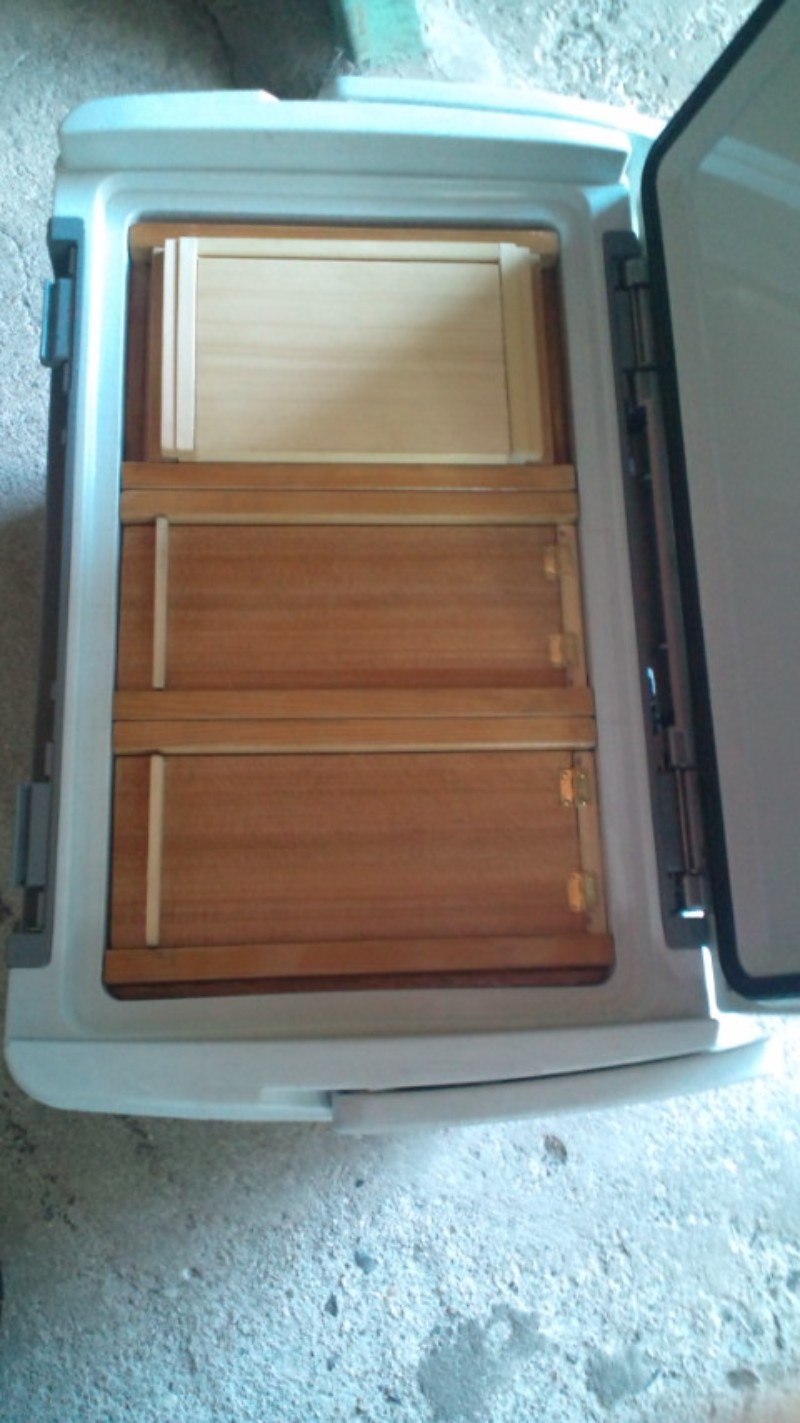 クーラーの中蓋を二つ作った、一つは3個に分離した型ともう一つ中蓋に3個の部品を 付けた物、それで両方使ってみたけれど分離型(今回の写真)の方が使い勝手が良いと思 う、良く売られてるのは一体型だけど中を何とかしたいときは、全て動かすので面白くな い、私だけかもしれないこれど。