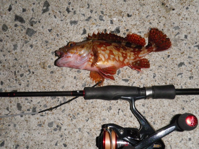 出かけた日が土日なので釣り人が多くて、私のポイントは既に釣り人が入っていて、今 日はアジに専念しようと、竿も一本だけと思っていた、釣りの準備にとなりのグループが タモを用意していたのを見たから、万が一大きいのがそこまで引っ張っていくつもりだっ た。(だから確信犯)