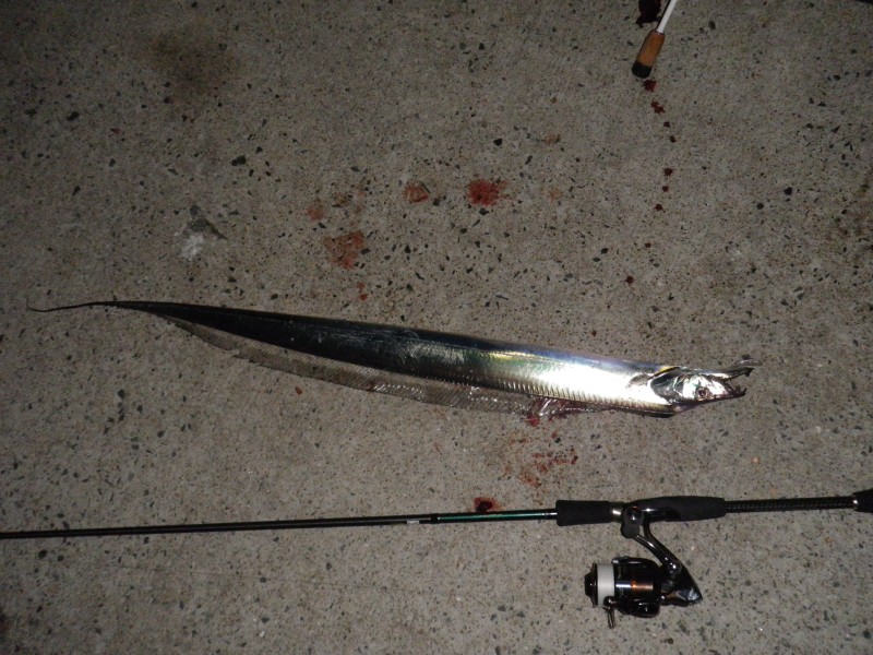 やっと釣った太刀魚、前回の釣行では、太刀魚釣りの準備をしなかったので、今回は 持ってきた、どうも太刀魚の数は多そう、しかしルアーでは反応がない、それでも最初の 一本は匠ミノー(ワーム)で釣った、確か3投目に食いついてきた、ルアーだと簡単、そ の後当たりはあるものの、見切られてしまう。