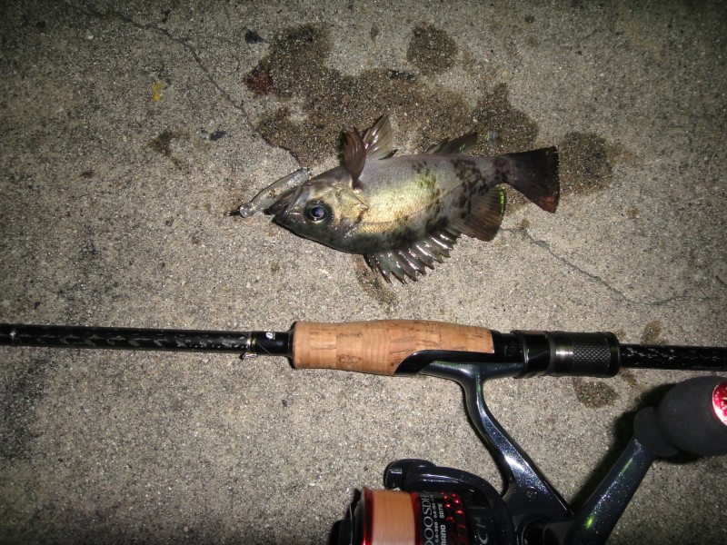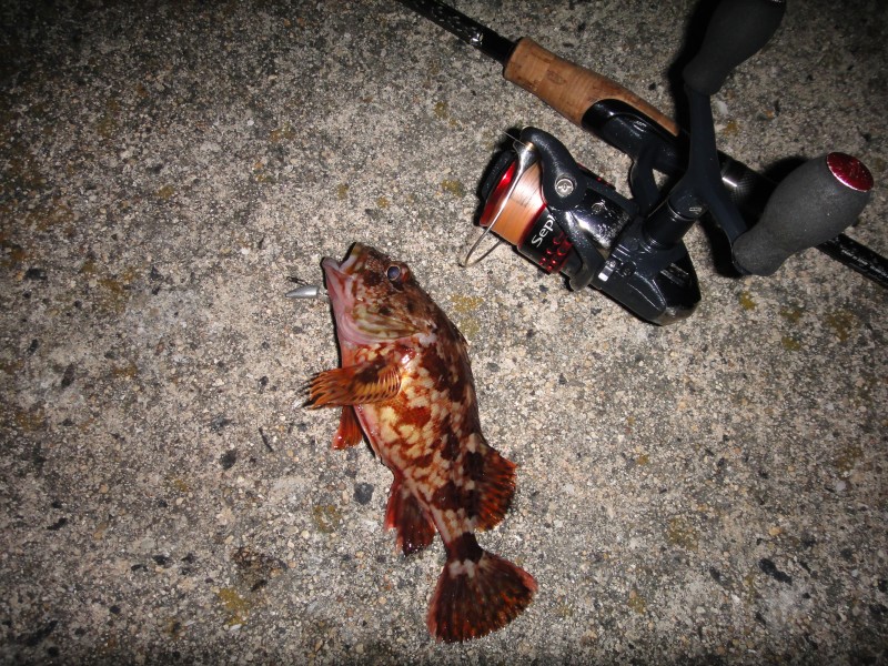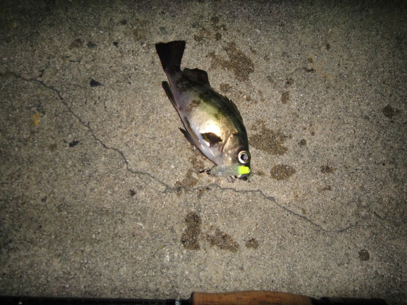 | 23:47 カブラでHit 仕掛けはスプリットリグでメインのオモリは0.9g〜3.5gでオモリとカブラまでは0.8号のフロロで1m ラインが短いと食いが落ちる、つまりスローな動きの方がいいみたい。 |