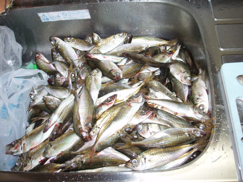 またまたアジ釣り アジ釣りは楽しい、釣れないで困ると言う事が、この島ではほとんど無い(あくまでア ジの場合) それで朝まで釣り放し 今回は大きいアジが釣れなかった、シラウオでの遠投も青虫も、地元の人が釣っても釣 れない。 太刀魚がいたのが原因か、今時期がそうなのか、こんな時もあるか。 それなら数釣りをしようと思い結果、286匹で今まで一晩でこんなに釣った事は無い、実 際こんなに 釣る必要も無い。(帰ってからの処理が大変)