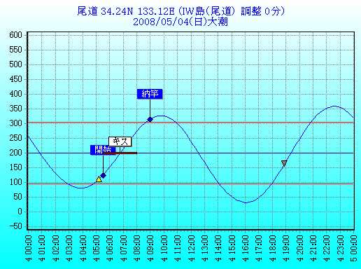 | 2008/05/04(日) | 大潮 | 9:48 22:33 | 3:51 16:04 | ||||||