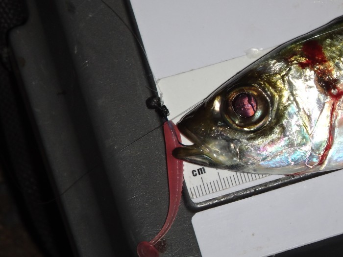 口の所でグジャグジャになってるのがカブラの魚皮とティンセルです、この状態で再び海水 に付けると元の形になります、ワームがずれる心配もなく手間いらずに釣れるのは、いいで す、これで数匹釣る事ができました、他に赤い魚皮のカブラもいい反応でした、もうカブラで 釣りができる時期なのでしょうか。 私の経験ではカブラはメバル釣り用との思いが強い漁具です、アジではほとんど試しません し試してもいい結果は出たことがありません、今回釣れたのは興味深いことです。