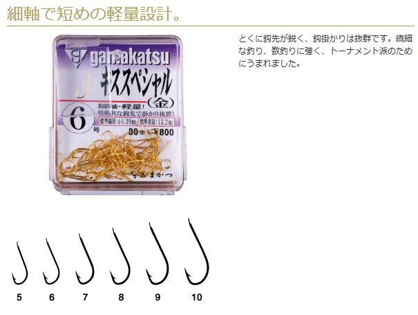 がまかつのキス鉤9号は、ルアーで胴突きをしていた時に使用した鉤です、キス鉤ですから吸 い込みを良くするためにゲイブが小さく、太いワームは付けてませんが、これをジグヘッドに して果たしてアジが釣れるか、やって見ました、結果は釣れます、それも上アゴに掛かりま す、スッポ抜ける事もありましたが、アジは軽量で小さな鉤は吸い込み易いのだと思いまし た、この鉤は意外と好印象でした、何事もやってみないとわからないことが多いです。