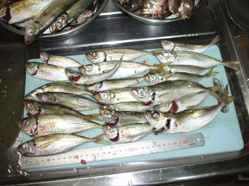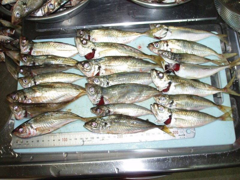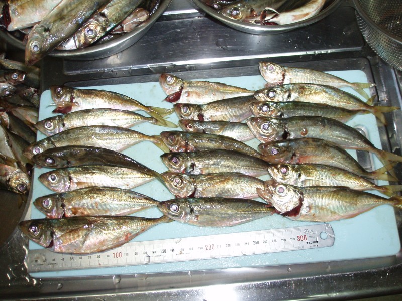 前回はアミエビを待たずに釣行したが、今回も最後まで悩んでとりあえず持つて行った が、アジは、アミエビ これで決まり、アミエビなしでは今回の釣果は望めなかった。 それにしても20cm位のアジで1.5号の竿が見事に曲がり、リールを巻くのが重たい。 一度掛かったアジに太刀魚が食ってきた、太刀魚を釣ってる地元の人もいた(釣れたかど うかは不明) アミエビ2個で長時間入れ食い状態だった、I島は、ほんとにアジの島 だね。 アコウもいるらしいので、いろんな場所を探してみよう。