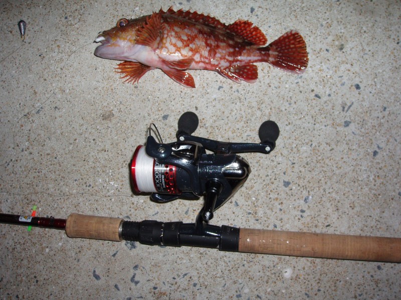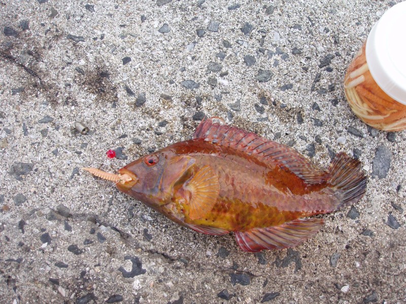 | メバル この島には結構メバルが居るようだ、前の日に大きいサイズをかなりの量釣ったと釣り客が話してくれた、浮き釣りで波止の下の捨て石を流しているようだ、餌はエビ、小さかったのでブツエビかも |