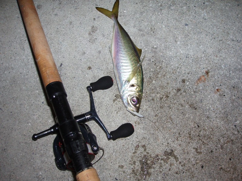 | アジを釣り始めると忙しいのと手がぬるぬるになるので画像はいつも無しなので今回は撮してみた、仕掛けはキャロライナリグ(ハードキャロライナリグかな重りか大きいから) |