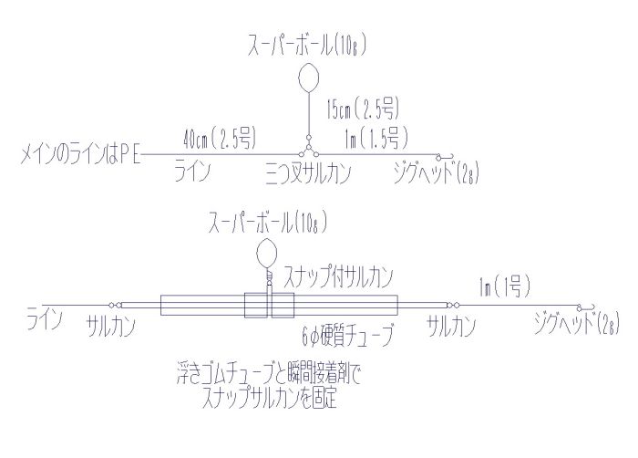 ない頭をフル活用して3本作った、それで、初めにこれを使ったのがお蔵入りだったSキャリーだった。 ちなみに図には書いてないけれど「サルカンからチューブそれからサルカン」の間のラインは10cmほど空けてある。