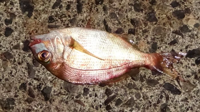 ボイルオキアミで、そこそこのサイズを、鉤ハズレで逃がしてしまった 何度かのアタリを掛けたら、鯛独特の引きだった、小さくても同じなんだ