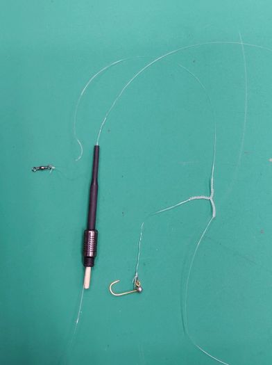 小さいキスもカワハギもダウンショットリグで釣ってる、つまり枝バリ仕掛けだね、この枝の部分は毎回工夫してるというか悩んでる、前回は回転ビーズでやってみた、今回はしっかり結んだ。
