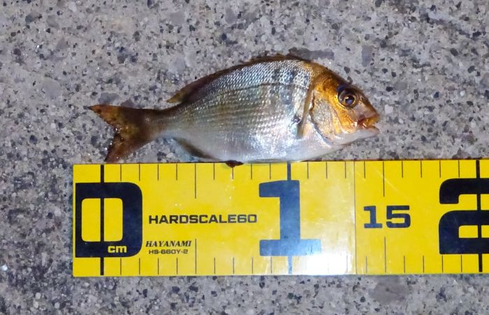 この小鯛が良い引きで、そこそこのサイズに見えたから不思議、測って見ると15cmでキープするのを躊躇った、でもまあ久しぶりなの、ごめんね。