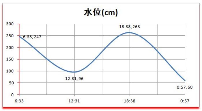 新月 ============== 時 | cm | 日 | 潮 ============== 06:33|247 |17:05入| 中 ---------------------------- 12:31| 96 |*******|**** ---------------------------- 18:35|263 |*******|**** ---------------------------- 00:57| 60 |06:48出| 中 ----------------------------