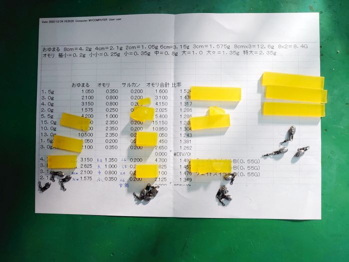 分かった気がするのは、比率を1,5にすればいいのだということ、比率というのは(全ての重さ/おゆまるの重さ)つまり(おゆまる+オモリ+サルカン)/(おゆまる)