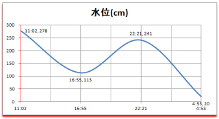 新月 ============== 時 | cm | 日 | 潮 ============== 11:02|278 |17:09入| 中 ---------------------------- 16:55|113 |*******|**** ---------------------------- 22:21|241 |*******|**** ---------------------------- 04:53| 20 |07:14出| 中 ----------------------------