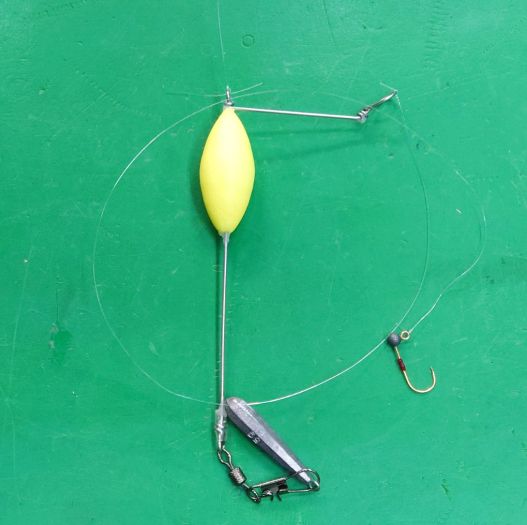 この仕掛けはオモリを重くしても、仕掛けは必ず浮くのが利点、引くとエダスは一度浮く、止めるとゆっくり沈むのが誘いになると思ってる。