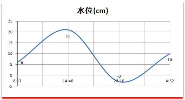 満月 ============== 時 | cm | 日 | 潮 ============== 08:17| 6 |18:59入| 中 ---------------------------- 14:40| 21 |*******|**** ---------------------------- 22:10| -3 |*******|**** ---------------------------- 04:52| 10 |05:08出| 中 ----------------------------