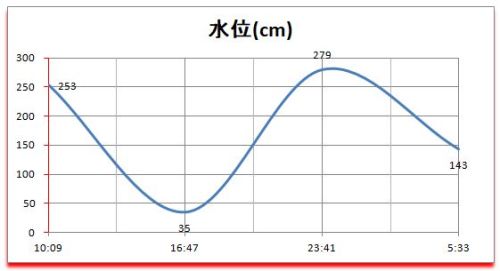満月 ============== 時 | cm | 日 | 潮 ============== 10:09|253 |19:20入| 中 ---------------------------- 16:47| 35 |*******|**** ---------------------------- 23:41|279 |*******|**** ---------------------------- 05:33|143 |05:00出| 中 ----------------------------