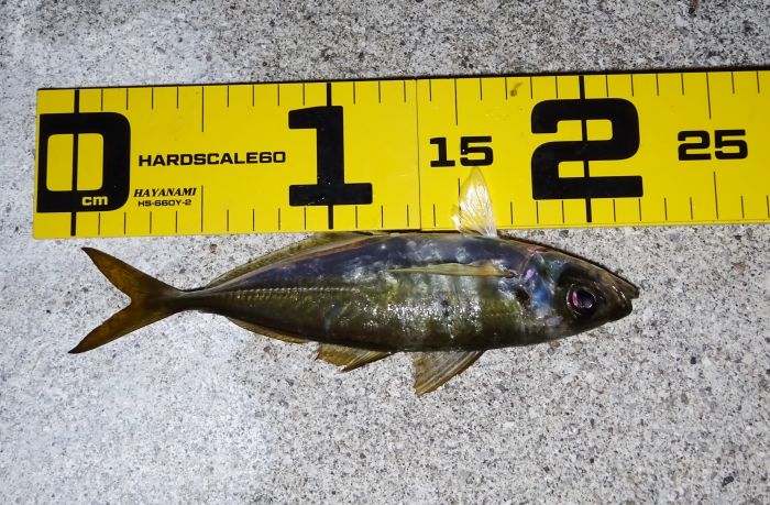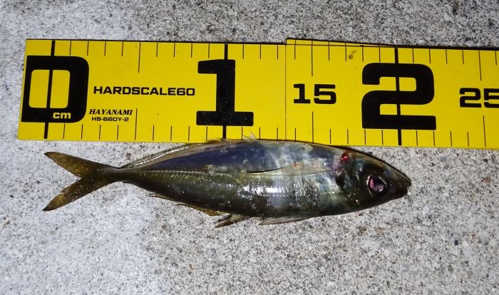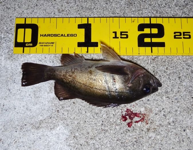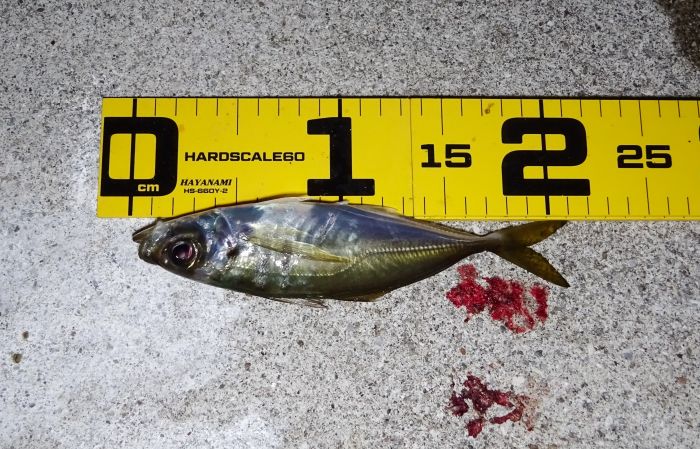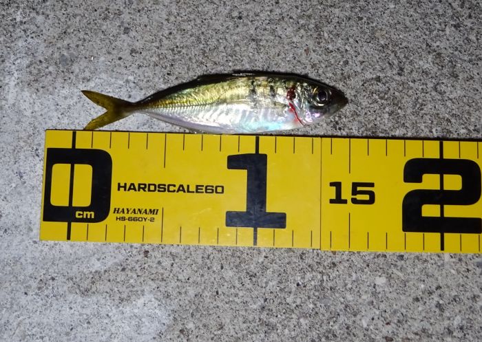 これが15cmくらいなのでキープした、この後このサイズが良く釣れた、15cm以下は数匹リリースしたが、これはスズキのエサだろう。