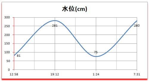 満月 〇 =================== 時 | cm | 日 | 潮 | 月 =================== 12:58| 81 |17:25入| 中 | 15:59出 -------------------------------------- 19:12|281 |*******|****| ******* -------------------------------------- 01:24| 75 |*******|****| ******* -------------------------------------- 07:31|280 |06:25出| 中 | 04:16入 --------------------------------------