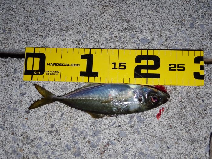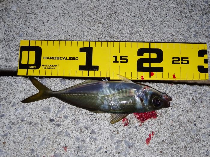 下げ潮からスタートで、最初に釣れたの18cmのアジ、アジが大きくなってる