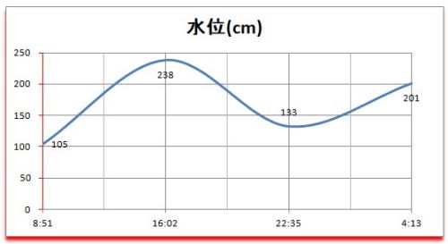 新月 ● =================== 時 | cm | 日 | 潮 | 月 =================== 08:51|105 |17:05入| 小 | 13:30出 -------------------------------------- 16:02|238 |*******|****| ******* -------------------------------------- 22:35|133 |*******|****| ******* -------------------------------------- 04:13|201 |06:49出| 長 | 00:54入 --------------------------------------