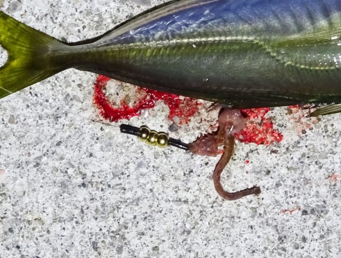 でも、チモトが切れて鈎を結ぶときに、簡単に結んでも問題なく釣れるので、通常のエサ用の、例えばアジ鈎でも使える。