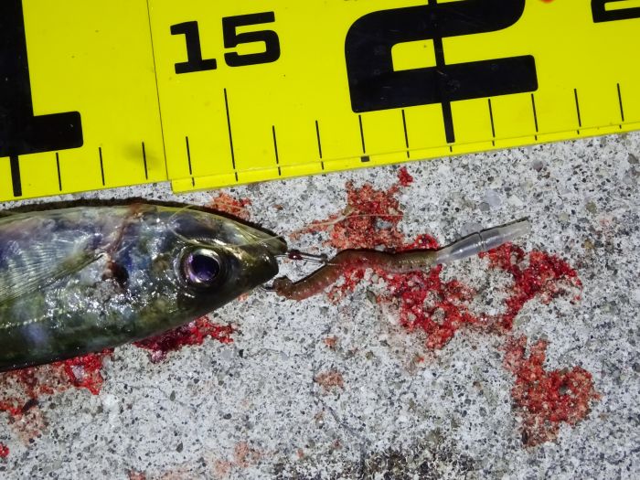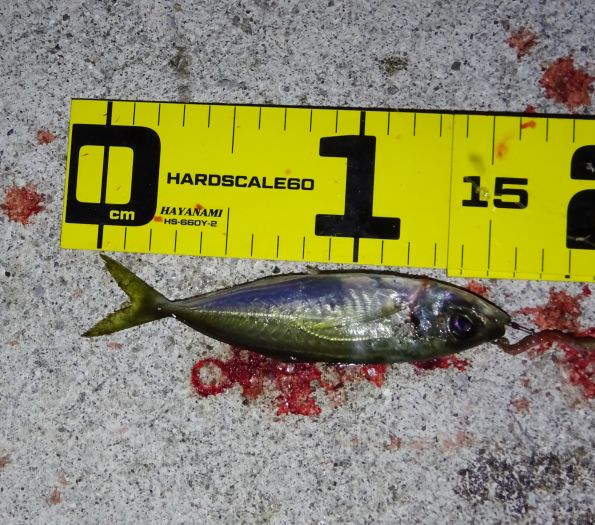 上のこのアジは7.4ftの竿で今回試したかった仕掛け(仕掛けと言うほどの物じゃないけど)で釣った、記念したい1匹。