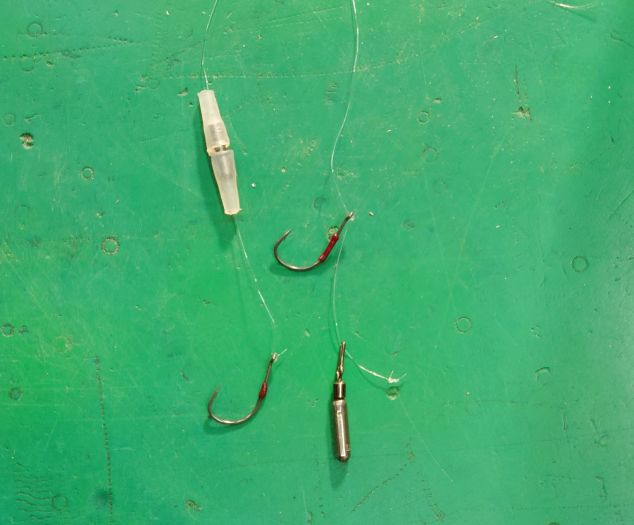 後で思い付いた仕掛けはオモリ交換ができない、その代わり多少はスリム、メインで使った方はオモリ交換が可能だが仕掛けが大きくなる。