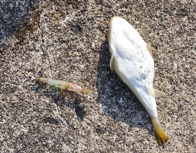 プラグでフグが釣れた、フグはなんでも喰いつく。