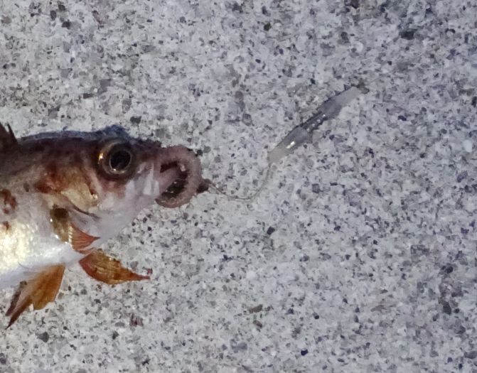 相手と言うのは確かにメバル、メタルジグで23pを掛けた後の事、同じメタルジグに喰ってきた、見事な引き、一瞬根掛と思った、まさか表層で根掛はないが、掛けた瞬間は根掛と思うほどに引けなかった。