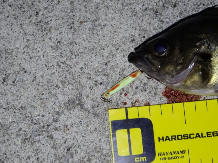 シンキングペンシルで小メバル、シンキングペンシルは良いと思うけど一定巻きのできない私には難しい。