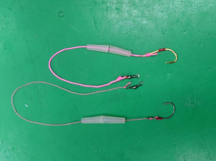 上がブラーの替え鈎用で市販のもの、下がメバル鈎10号に0.6号のPEライン。