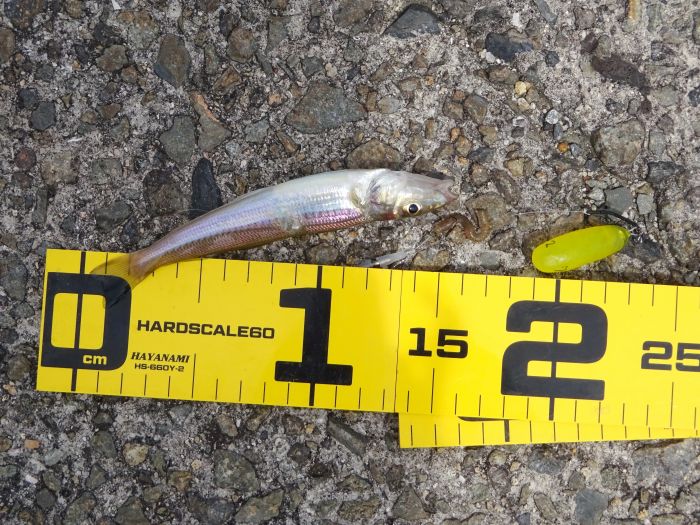 嬉しい今日は二匹のアジになったと喜ぶ、ところがアジは止まらなかった、釣れる場所は表層、飛距離がもう少し欲しいのでジグヘットを1.4gに変える。