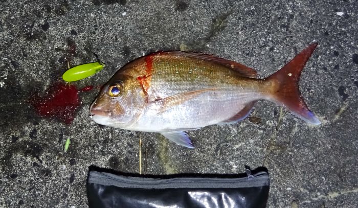 鯛は久しぶりだし、釣れてほんとに嬉しかった。もしかして引き抜けないかと思ったが大丈夫だった、ラインもPE0.4号だし仕掛けも2号、チモトは1号だけどナイロンだからフロロよりは細くて強いはず。