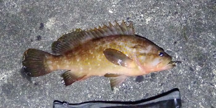 アコウを釣った後でアジを二匹逃がし、といっても引きの感じでこれはアジと思った二匹だけど、三匹目は引き抜いたとたん足元に落ち慌てて掴めなかった。