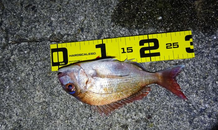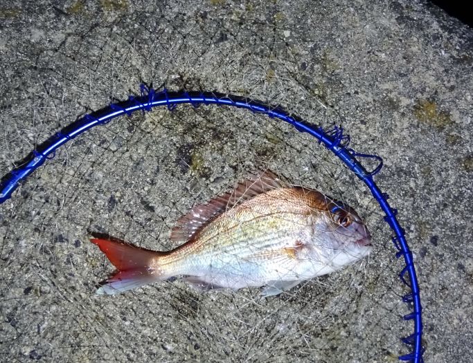 タモは前回のチヌで使って今度は鯛、この鯛は引き抜くこともできたと思うけれど、そこは安全に、タモのあるのだから。