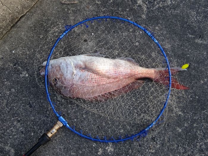 フロートリグで底を狙って、やっとアジと思ったらこれが鯛だった、どうも早巻きで回収してるのに何時までも暴れると思った。