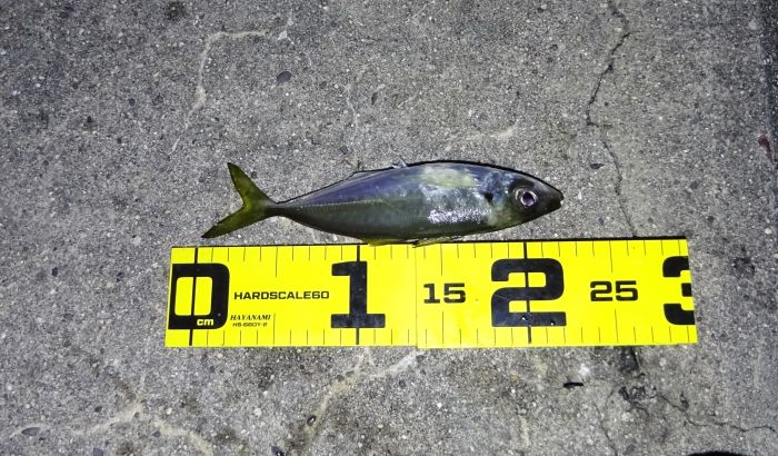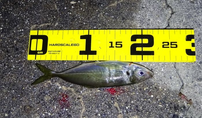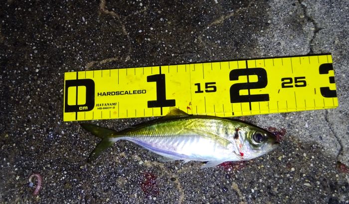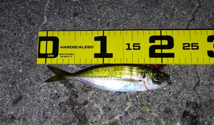 これが最初のアジ、時間を見ると、1時間までではないが1時間近くは釣れなかったって事