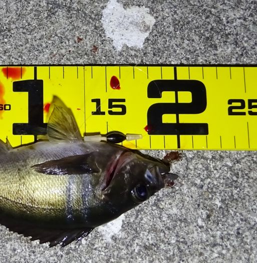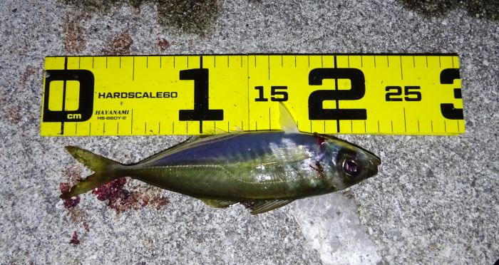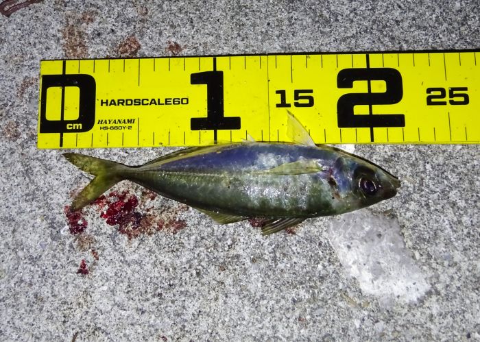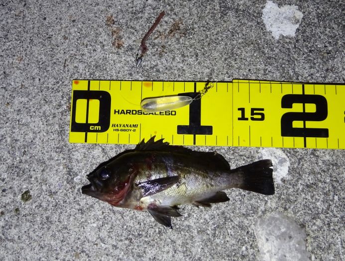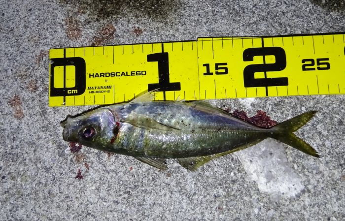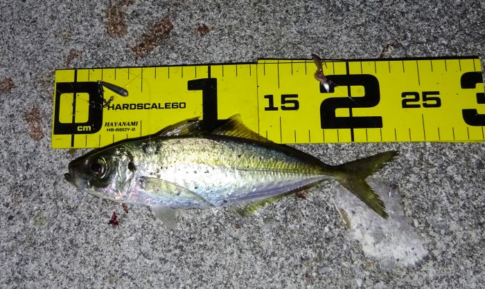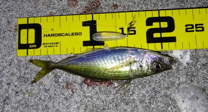 これは3.5gで釣ったアジ、しかし3.5gでも根に掛かりそうなので最終的にはフロートのSに変えた。
