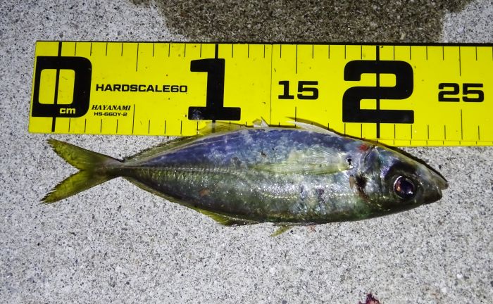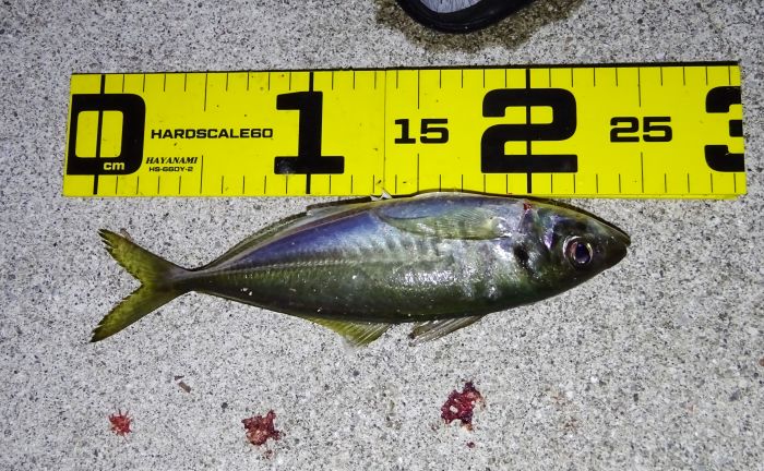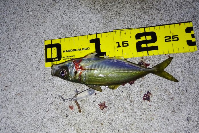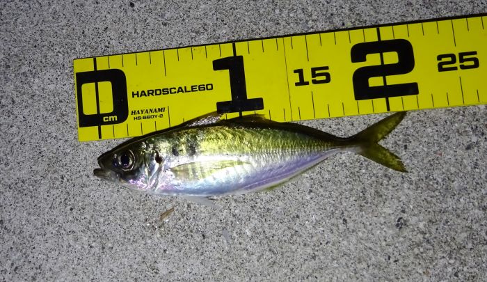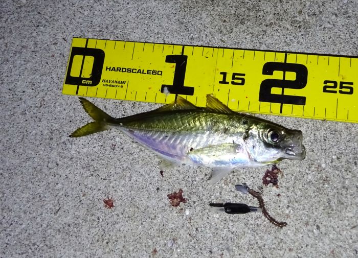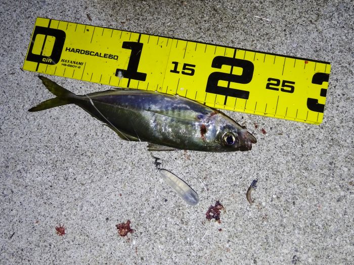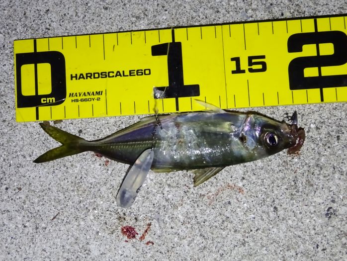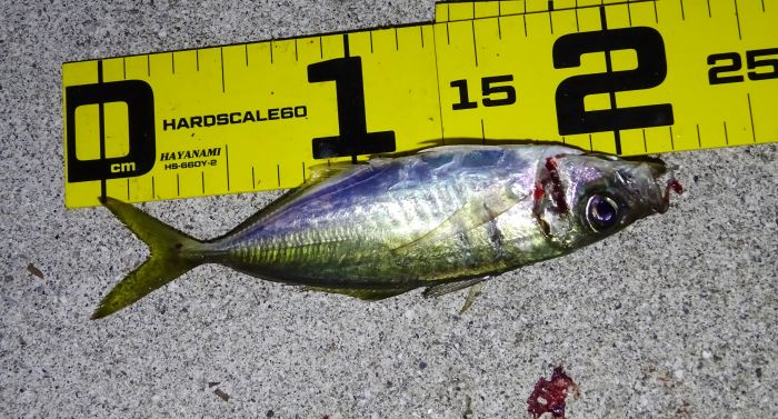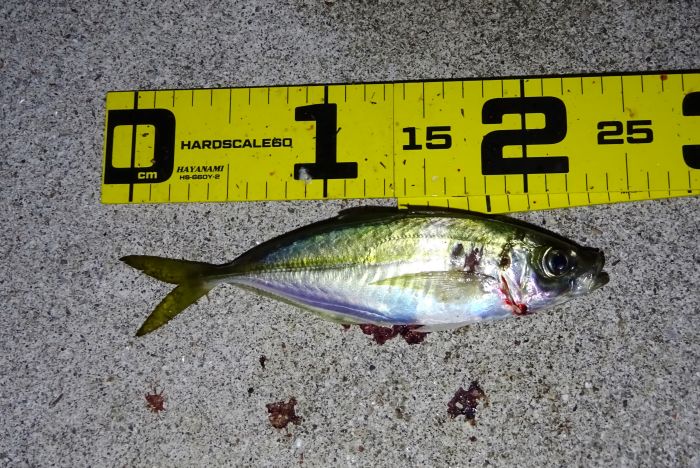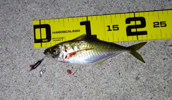 次に釣れ出したのは22:30くらいから満潮の潮止まり付近、それからの海面はパラダイス、表層では小サバ、小アジが群れてる、それをスズキが表層に追い込んでボイル音がする、表層を釣れば小サバ、中層を釣れば小アジ、アジのサイズの良いのは底と知る。