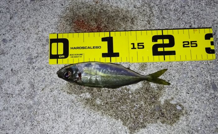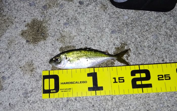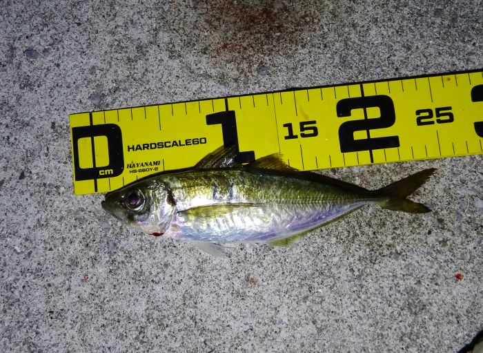 替わった場所では、数投で小アジが釣れた16cmくらいか測ってない、2〜3匹で釣れなくなった、22:00頃とだった気がする。