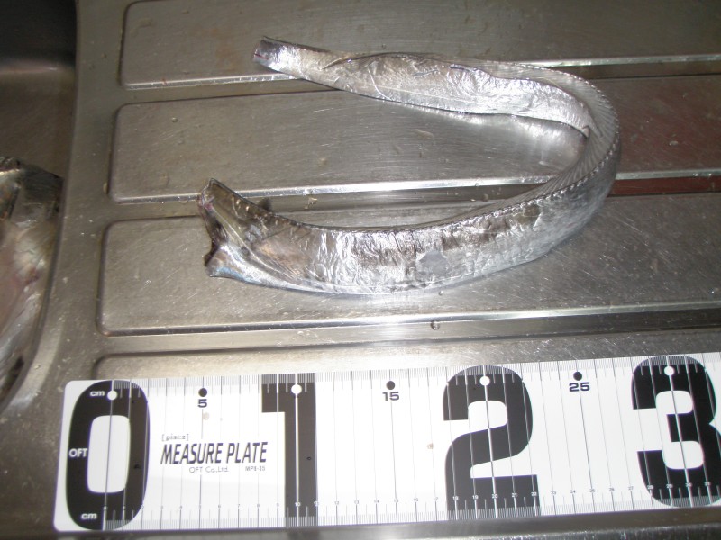 | 小さい太刀魚、がんばってみたけどつれなかった でも今回やっとワインド釣法が分かった、これからは、まぐれではなくて、釣れそう。 それにしても頭もしっぽなくては絵にならないナー、もっと大きい太刀魚が釣れる予定だったので、現場で撮さなかったけど、撮っとけば良かった。 |