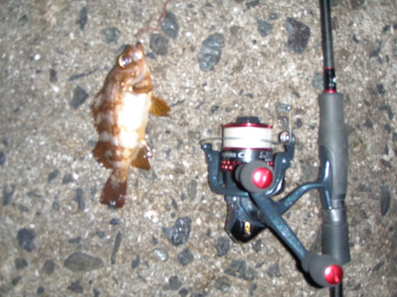 | ダウンショットで釣った、桟橋直下に居たメバル、小さくても良く引くメバルは、楽しい。 あまりに釣れないので、メバルに遊んでもらいました。 |