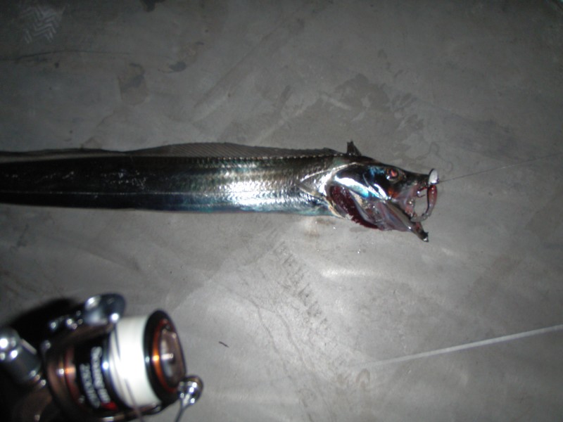 | 最初に釣れた、太刀魚、小さいけれど嬉しかった、やっとキープできる魚が釣れたと思った。 匠魚TK−02 スパークルレッドヘッドも良い位置で写ってる(偶然ですよ) |