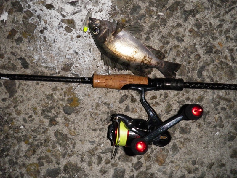 | 0200頃釣れたメバル プラグが絶好調です。 この後このプラグは大きめのメバルでラインブレークにて、なくしてしまいました。 惜しい!! ここではこの系統のプラグが良かった |