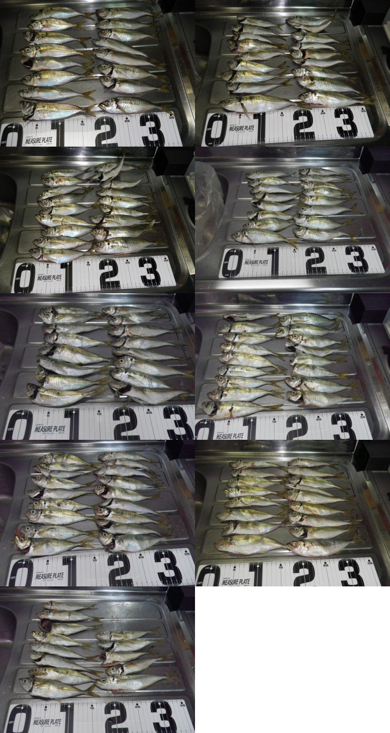 | アジ | 18.0 Cm 〜 23.0 Cm | 75 匹 | 12日 19:30 〜 23:59 | 309 Cm | サビキ | |