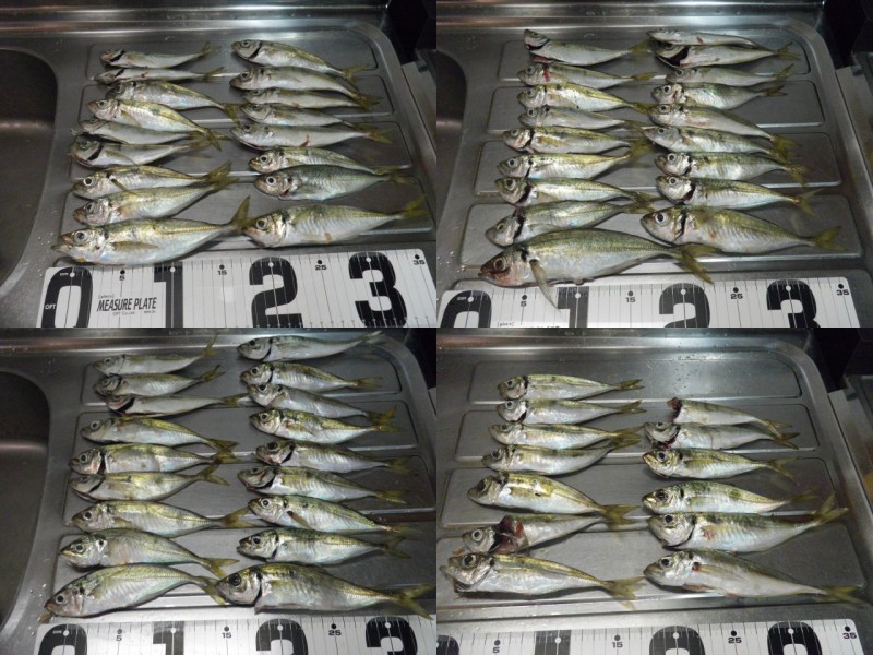 | アジ | 16.0 Cm 〜 23.0 Cm | 46 匹 | 26日 0:00 〜 4:00 | 279 Cm | サビキ |