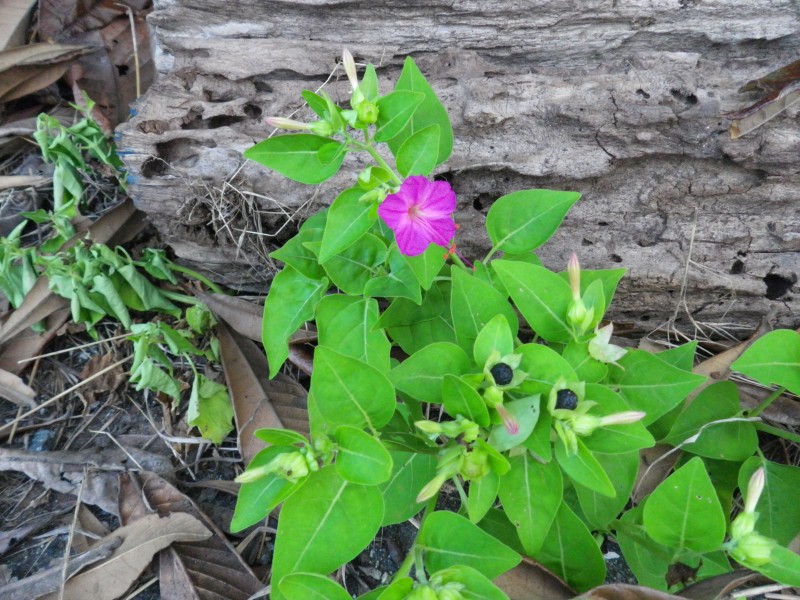 | 朽ち果てた木と枯葉の中で、綺麗に咲いた小さな花 心引かれてデジカメをパチリ! |
